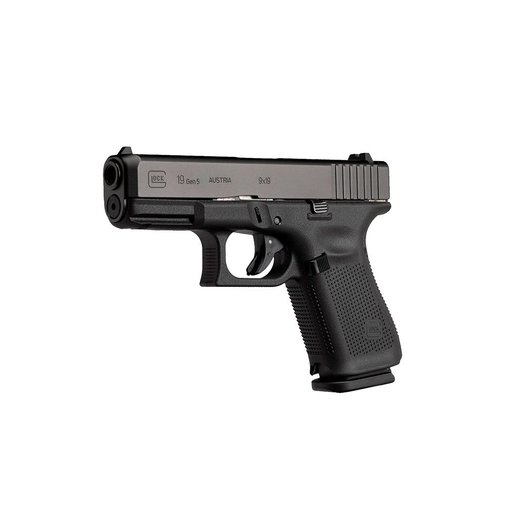 Calibre 9 mm. Semiautomática. Capacidad del cargador de 15 cartuchos. Sistema de disparo Safe Action. Longitud del cañon 102 mm. Terminación pavonada. Armazón de polímero. El modelo 19 Gen5 es el mejor ejemplo de la constante búsqueda de perfección de Glock. Fueron realizados más de veinte cambios respecto al diseño anterior, incluyendo un retén de corredera ambidiestro y un grip sin finger grooves. Los cambios mejoran su precisión, durabilidad, performance y la flexibilidad en situaciones donde cada segundo es importante.